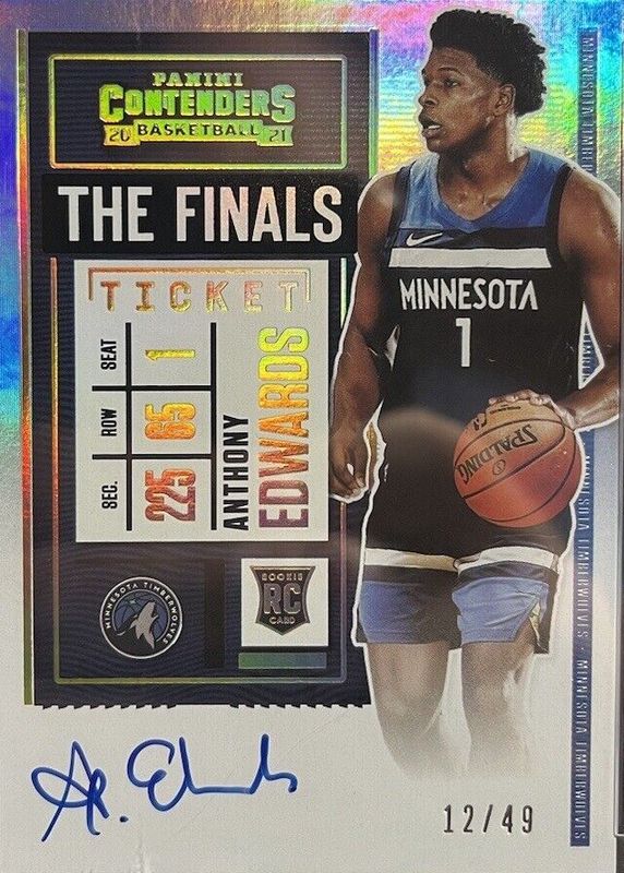 The Anthony Edwards 2020 Contenders #105 Rookie Ticket Auto - Finals Ticket /49 (Ball in Left Hand) card in Raw condition has not changed in price in the last 30 days and was last sold for $3,840.00 .