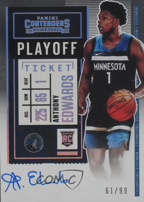 The Anthony Edwards 2020 Contenders #105 Rookie Ticket Auto - Playoff Ticket /99 (Ball in Left Hand) card in Raw condition has not changed in price in the last 30 days and was last sold for $1,049.99 .