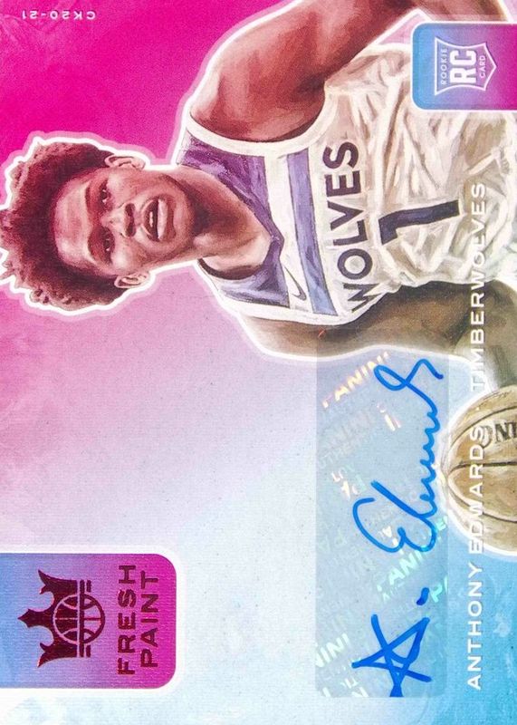 The Anthony Edwards 2020 Court Kings #FP-AED Fresh Paint Autographs - Ruby (/49) Rookie card in Raw condition has not changed in price in the last 30 days and was last sold for $435.00 .