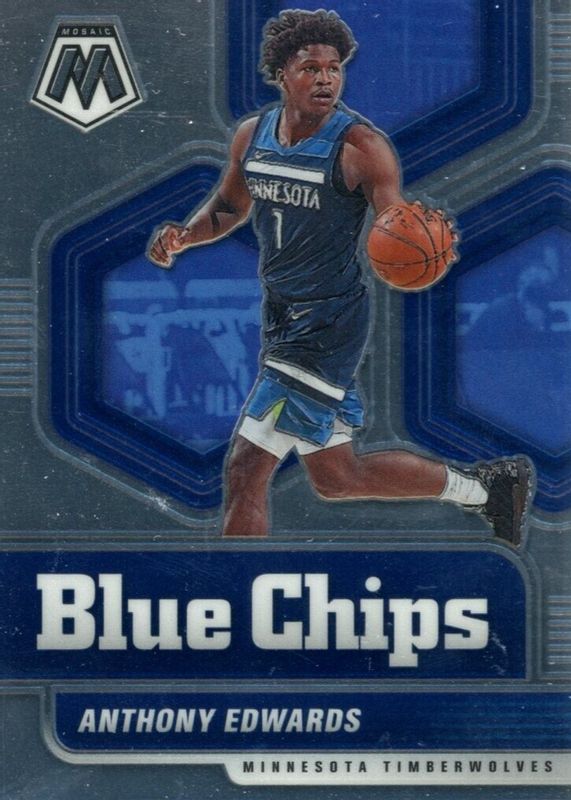 The Anthony Edwards 2020 Mosaic #14 Blue Chips Rookie card in Raw condition has moved up $3.47 (+154%) in the last 30 days and was last sold for $5.72 .