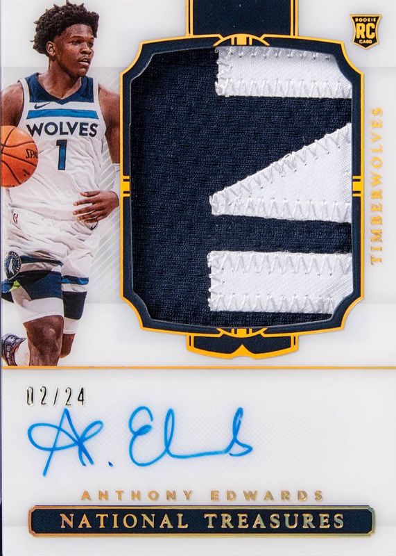 This card is 1 of 22 Anthony Edwards' card variations in the 2020 National Treasures set being tracked by Sports Card Investor, including Rookie Patch Auto /99, Rookie Patch Auto - Gold /10, Rookie Patch Auto - Purple FOTL /8, Rookie Patch Auto - Emerald /5, and Rookie Patch Auto - Blue FOTL /3.