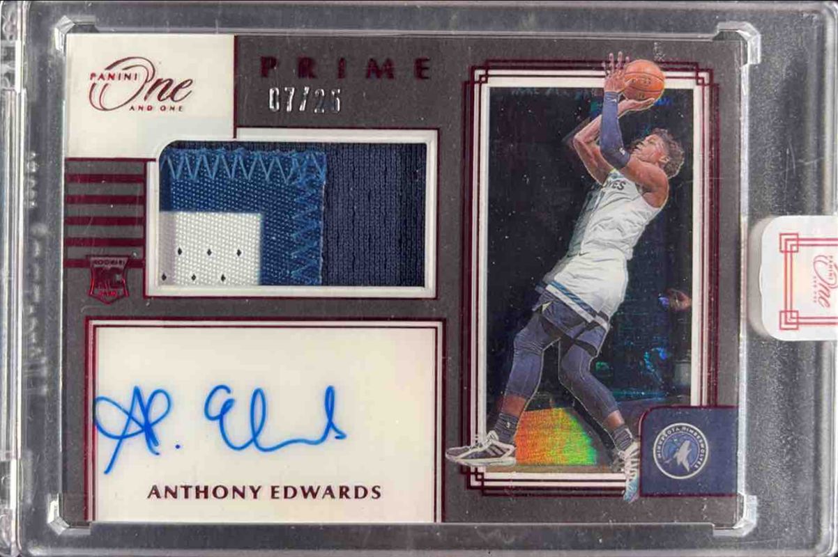The Anthony Edwards 2020 One and One #PRJ-AED Prime Rookie Jersey Autographs - Red /25 card is 1 of 43 Anthony Edwards' card variations in the 2020 One and One set being tracked by Sports Card Investor, including Base /99, Blue /30, Purple /25, Red /15, and Gold /10.