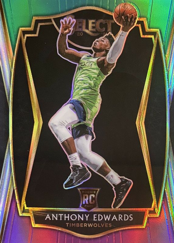The Anthony Edwards 2020 Select #169 Premier Level Green White Purple Rookie card in Raw condition has moved up $3.50 (+25.9%) in the last 30 days and was last sold for $17.00 .