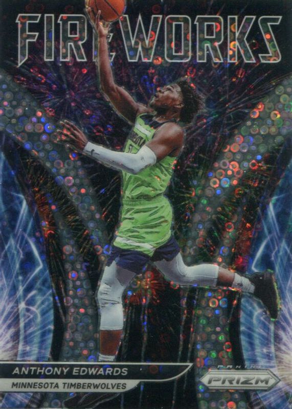 The Anthony Edwards 2021 Prizm #23 Fireworks - Fast Break card in Raw condition has moved up $3.01 (+43.0%) in the last 30 days and was last sold for $10.00 .
