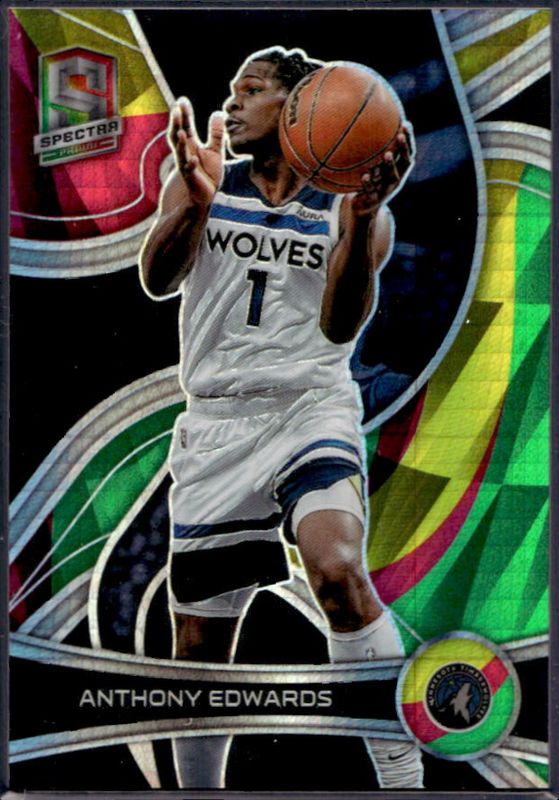The Anthony Edwards 2021 Spectra #5b Asia Red, Yellow & Green /75 card is 1 of 89 Anthony Edwards' card variations in the 2021 Spectra set being tracked by Sports Card Investor, including #162 Base, #5 Base, #5b Base, #162 75th Anniversary, and #5b 75th Anniversary.