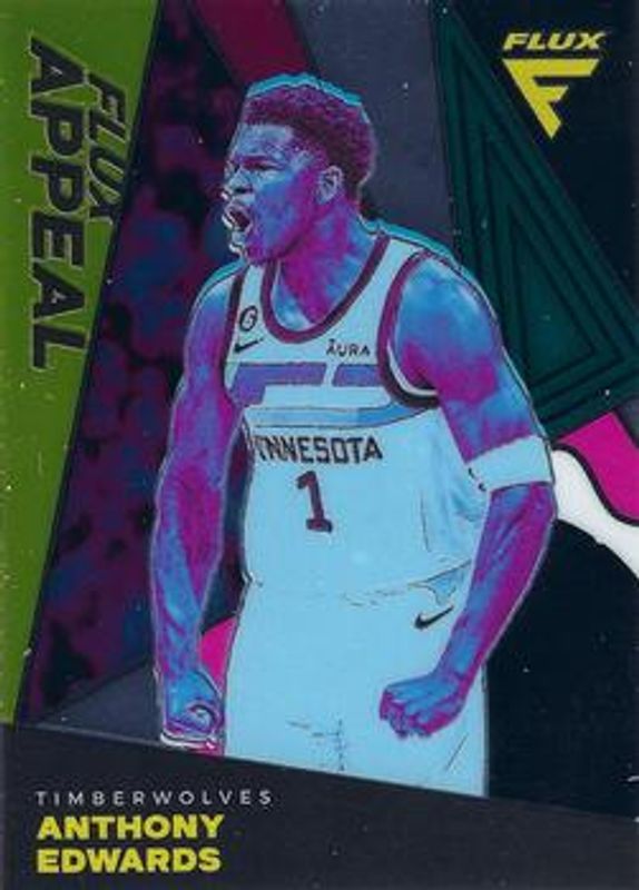 The Anthony Edwards 2022 Flux #19 Flux Appeal card is 1 of 37 Anthony Edwards' card variations in the 2022 Flux set being tracked by Sports Card Investor, including Base, Moonlight, Red, Silver Mojo, and Blue /99.