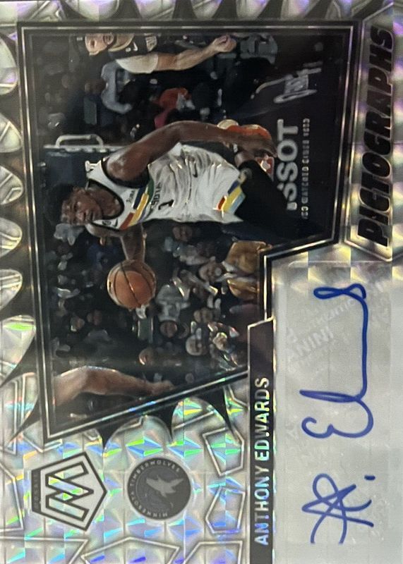 The Anthony Edwards 2022 Mosaic #PM-ANT Pictographs Autographs card in Raw condition has moved up $32.50 (+19.4%) in the last 30 days and was last sold for $200.00 .