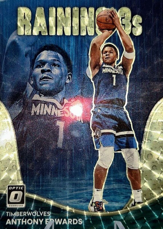 The Anthony Edwards 2022 Optic #2 Raining 3s - Gold Vinyl /1 card in Raw condition has not changed in price in the last 30 days and was last sold for $958.00 .