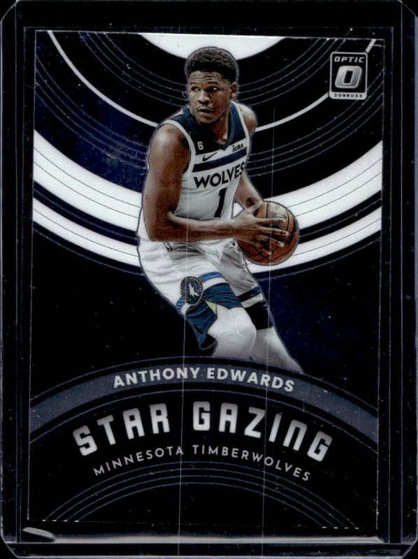 The Anthony Edwards 2022 Optic #14 Star Gazing card is 1 of 134 Anthony Edwards' card variations in the 2022 Optic set being tracked by Sports Card Investor, including Base, Checkerboard, Choice Red & Green, Fast Break, and Green Shock.