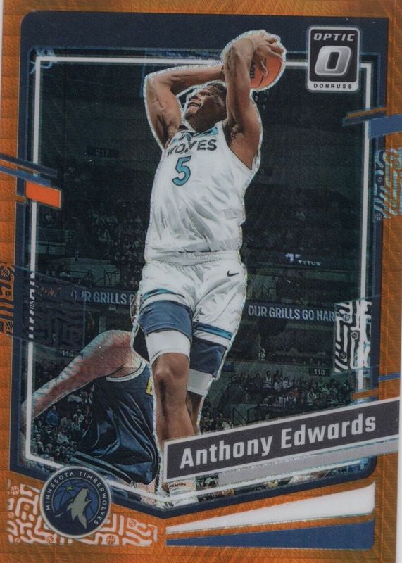 The Anthony Edwards 2023 Optic #59 Hyper Orange /99 card in Raw condition has moved down -$5.50 (-35.5%) in the last 30 days and was last sold for $10.00 .