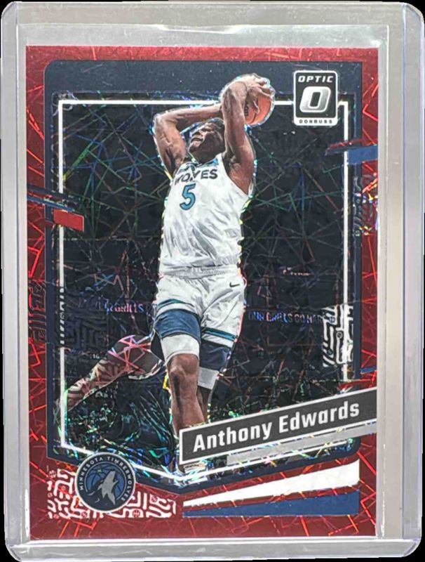 The Anthony Edwards 2023 Optic #59 Red Velocity /299 card is 1 of 117 Anthony Edwards' card variations in the 2023 Optic set being tracked by Sports Card Investor, including Base, Blue Velocity, Checkerboard, Choice Red & Green, and Fast Break.
