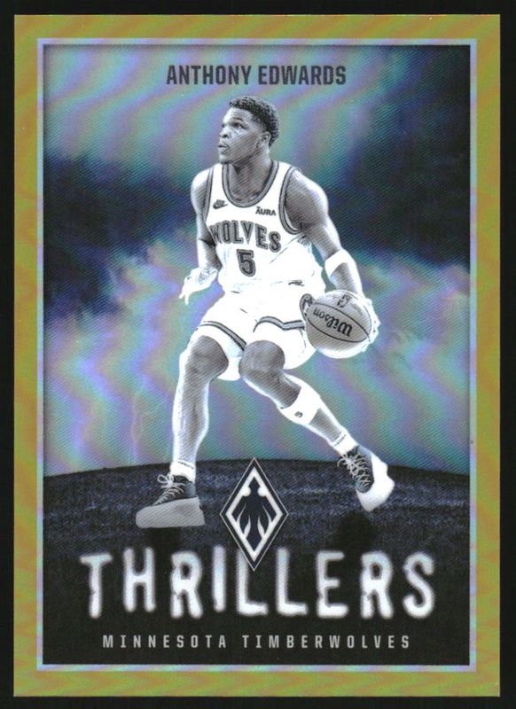 The Anthony Edwards 2023 Phoenix #9 Thrillers - Gold /10 card is 1 of 168 Anthony Edwards' card variations in the 2023 Phoenix set being tracked by Sports Card Investor, including Base, Blue Ice, Color Burst, Dream Weaver, and Hieroglyphs.