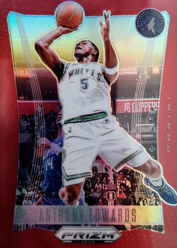 The Anthony Edwards 2023 Prizm Deca #63 Red /199 card in Raw condition has moved up $8.50 (+73.9%) in the last 30 days and was last sold for $20.00 .