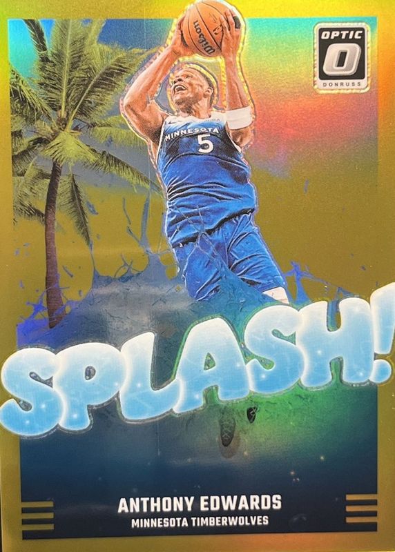 The Anthony Edwards 2024 Optic #7 Splash! - Gold /10 card in Raw condition has not changed in price in the last 30 days and was last sold for $246.52 .