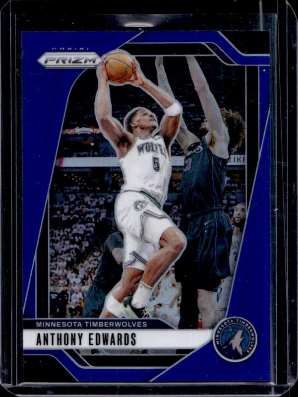 The Anthony Edwards 2024 Prizm #100 Blue /199 card is 1 of 142 Anthony Edwards' card variations in the 2024 Prizm set being tracked by Sports Card Investor, including Base, Choice Blue Yellow Green, Green, Green Ice, and Green Wave.