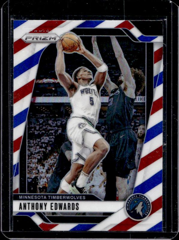 The Anthony Edwards 2024 Prizm #100 Red White Blue card is 1 of 142 Anthony Edwards' card variations in the 2024 Prizm set being tracked by Sports Card Investor, including Base, Choice Blue Yellow Green, Green, Green Ice, and Green Wave.