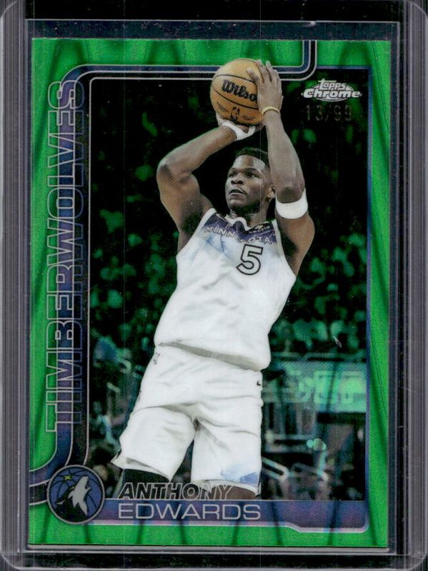 The Anthony Edwards 2025 Topps Chrome #151 Green RayWave Refractor /99 card is 1 of 193 Anthony Edwards' card variations in the 2025 Topps Chrome set being tracked by Sports Card Investor, including Base, Basketball Refractor, Box Set Refractor, Image Variation, and Lightboard Logo Refractor.