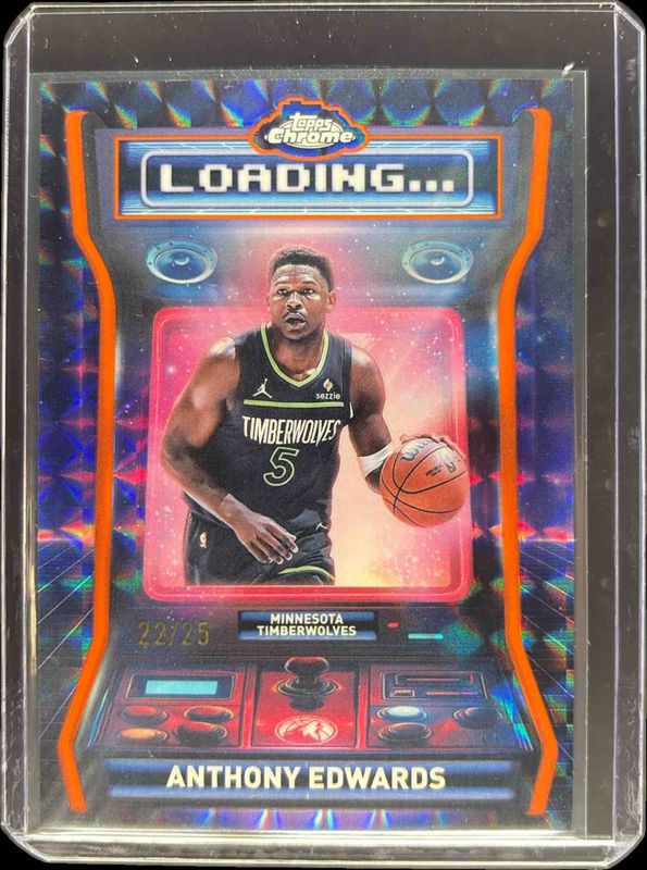 The Anthony Edwards 2025 Topps Chrome #LD-3 Loading - Orange Geometric Refractor /25 card is 1 of 193 Anthony Edwards' card variations in the 2025 Topps Chrome set being tracked by Sports Card Investor, including Base, Basketball Refractor, Box Set Refractor, Image Variation, and Lightboard Logo Refractor.