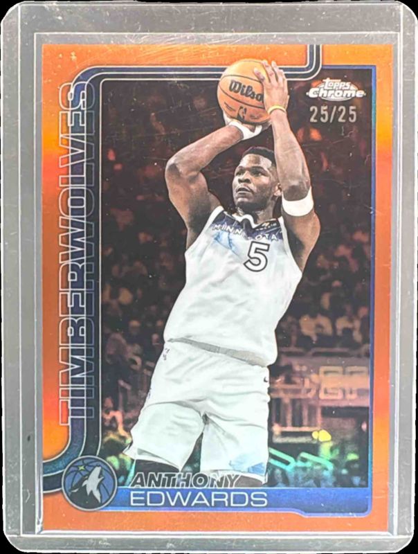 The Anthony Edwards 2025 Topps Chrome #151 Orange Refractor /25 card is 1 of 193 Anthony Edwards' card variations in the 2025 Topps Chrome set being tracked by Sports Card Investor, including Base, Basketball Refractor, Box Set Refractor, Image Variation, and Lightboard Logo Refractor.