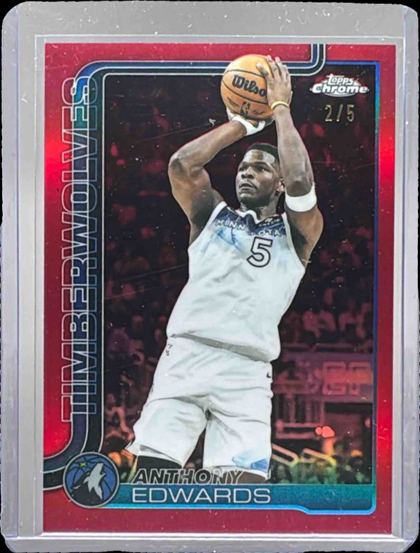 The Anthony Edwards 2025 Topps Chrome #151 Red Refractor /5 card is 1 of 193 Anthony Edwards' card variations in the 2025 Topps Chrome set being tracked by Sports Card Investor, including Base, Basketball Refractor, Box Set Refractor, Image Variation, and Lightboard Logo Refractor.