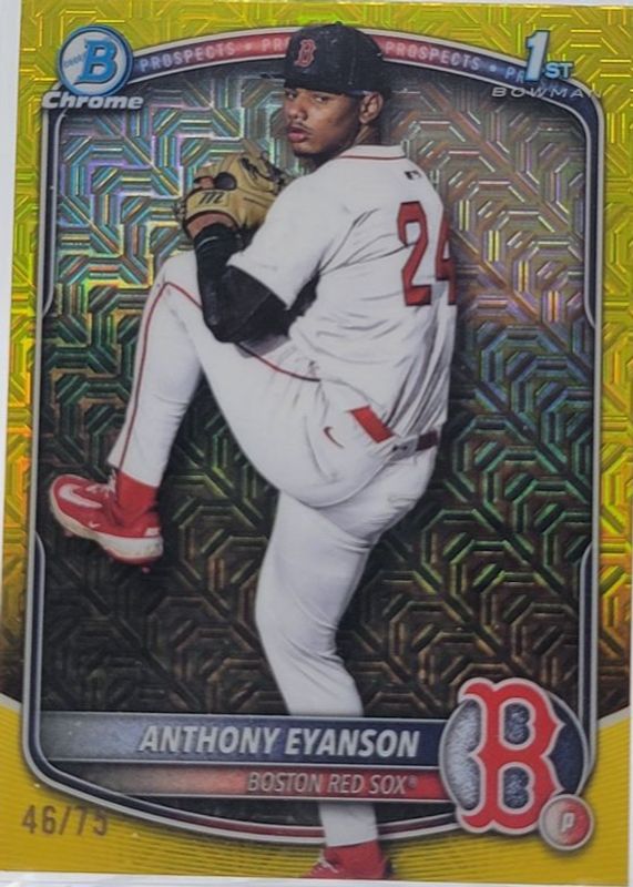 The Anthony Eyanson 2025 Bowman Draft Mega Box #BDC-116 Chrome - Yellow Mega Refractor /75 (1st) card in Raw condition has moved up $19.00 (+317%) in the last 30 days and was last sold for $25.00 .