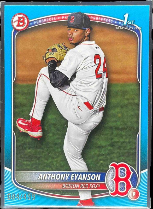 The Anthony Eyanson 2025 Bowman Draft #BD-116 Sky Blue Border /499 card is 1 of 86 Anthony Eyanson's card variations in the 2025 Bowman Draft set being tracked by Sports Card Investor, including Base, Chrome (1st), Chrome - Lazer Refractor (1st), Chrome - Refractor (1st), and Chrome - Sky Blue Refractor (1st).