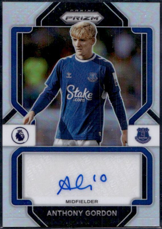 The Anthony Gordon 2022 Prizm Premier League #S-AGO Signatures - Silver /99 card is 1 of 71 Anthony Gordon's card variations in the 2022 Prizm Premier League set being tracked by Sports Card Investor, including Base, Breakaway, Choice Blue Yellow Green, Green Ice, and Green Pulsar.
