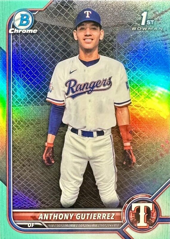 This card is 1 of 47 Anthony Gutierrez's card variations in the 2022 Bowman Chrome set being tracked by Sports Card Investor, including Prospects (1st), Prospects - Black & White Mini-Diamond Refractor (1st), Prospects - Shimmer Refractor (1st), Prospects - Refractor /499 (1st), and Prospects - Speckle Refractor /299 (1st).