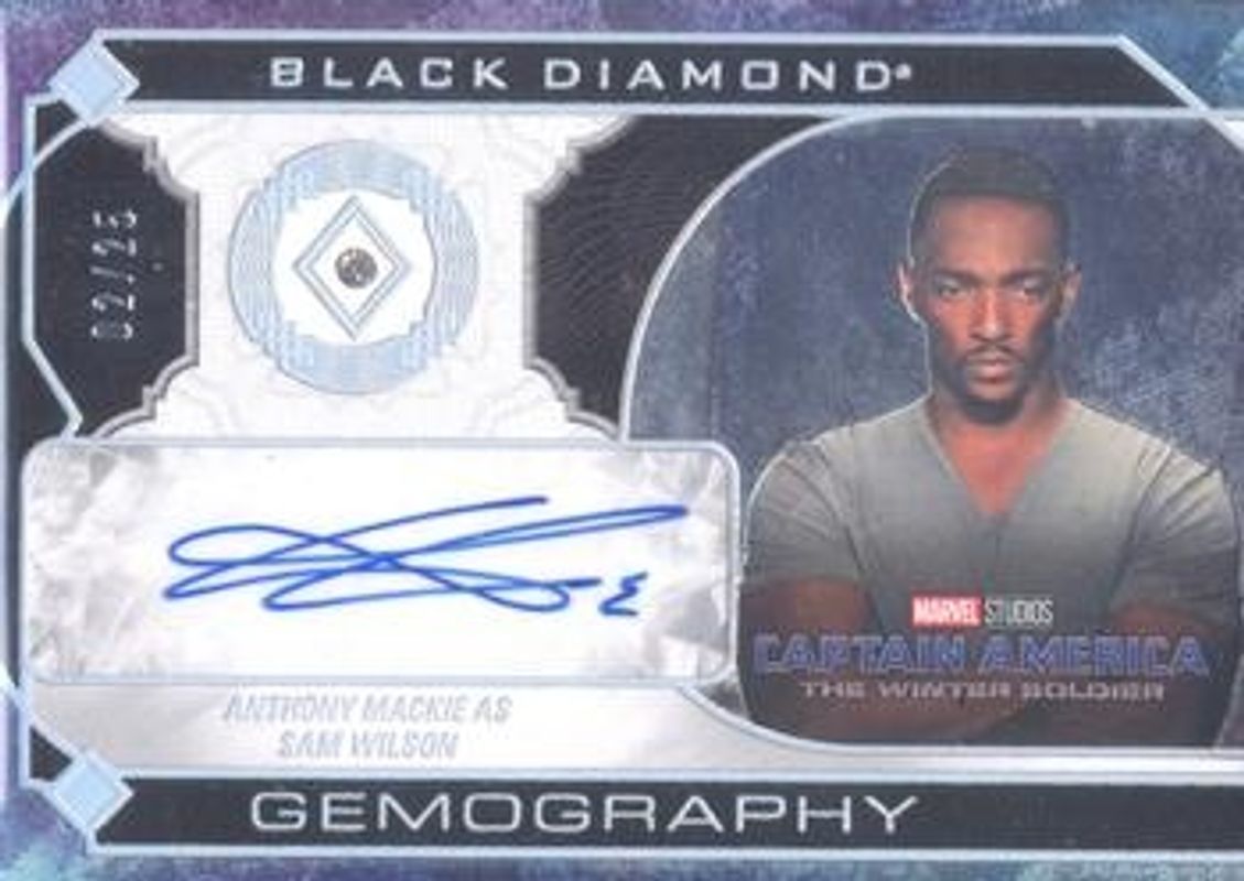 The Anthony Mackie 2021 Upper Deck Marvel Black Diamond #G-AM Gemography Auto Diamond /25 card is 1 of 25 Anthony Mackie's card variations in the 2021 Upper Deck Marvel Black Diamond set being tracked by Sports Card Investor, including Base /149, Red /35, Diamond Relics /5, Diamond Facet, and Diamond Plate Autographs.