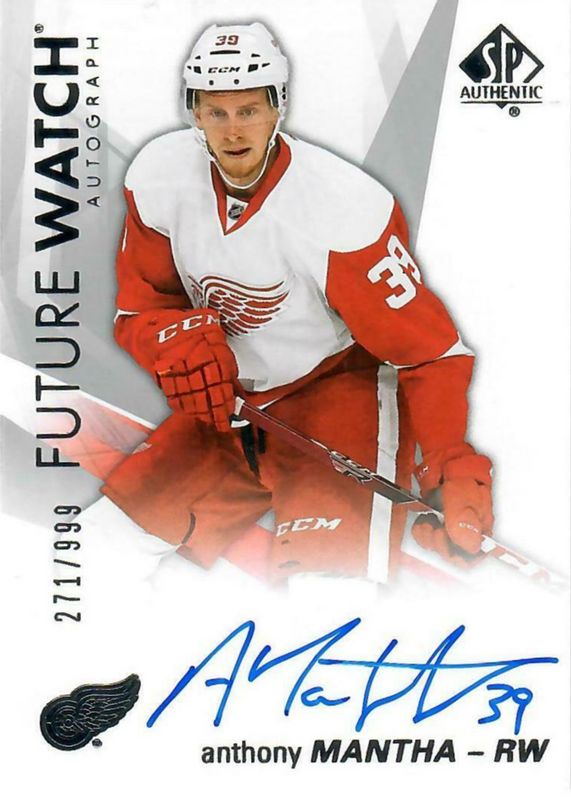 Anthony Mantha's Hockey cards are available in at least 97 sets. Anthony Mantha's biggest 7-day price movers are 2016 SP Authentic #124 Future Watch Auto /999, 2016 Upper Deck The Cup #104 Rookie Patch Auto (/249), and 2016 Upper Deck #213 Young Guns - UD Midnight /25.