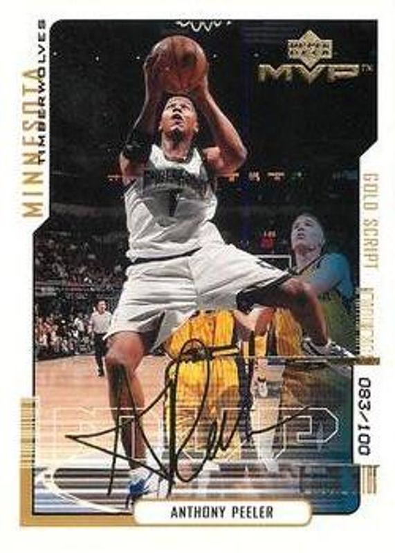The Anthony Peeler 2000 Upper Deck MVP #101 Gold Script /100 card is 1 of 4 Anthony Peeler's card variations in the 2000 Upper Deck MVP set being tracked by Sports Card Investor, including Base, Silver Script, and Super Script /25.