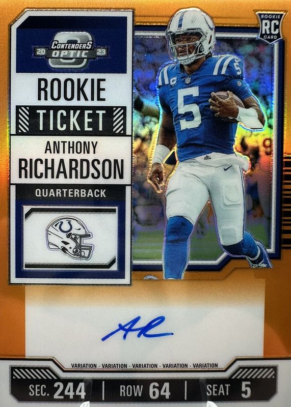 This card is 1 of 51 Anthony Richardson's card variations in the 2023 Contenders Optic set being tracked by Sports Card Investor, including Rookie of the Year Contenders Autographs - Blue (/45), Rookie Ticket Auto, Rookie Ticket Auto - Red (/125), Rookie Ticket Auto - Silver, and Rookie Ticket Auto Variation.