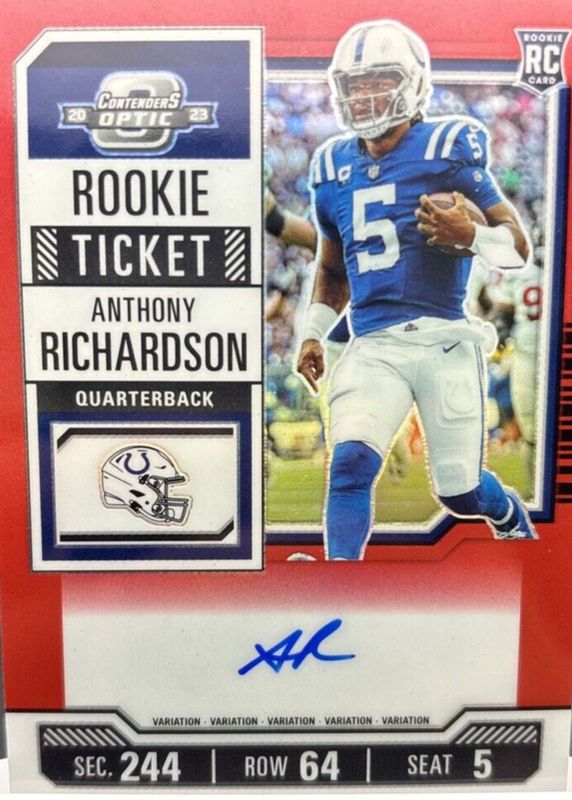This card is 1 of 51 Anthony Richardson's card variations in the 2023 Contenders Optic set being tracked by Sports Card Investor, including Rookie of the Year Contenders Autographs - Blue (/45), Rookie Ticket Auto, Rookie Ticket Auto - Red (/125), Rookie Ticket Auto - Silver, and Rookie Ticket Auto Variation.