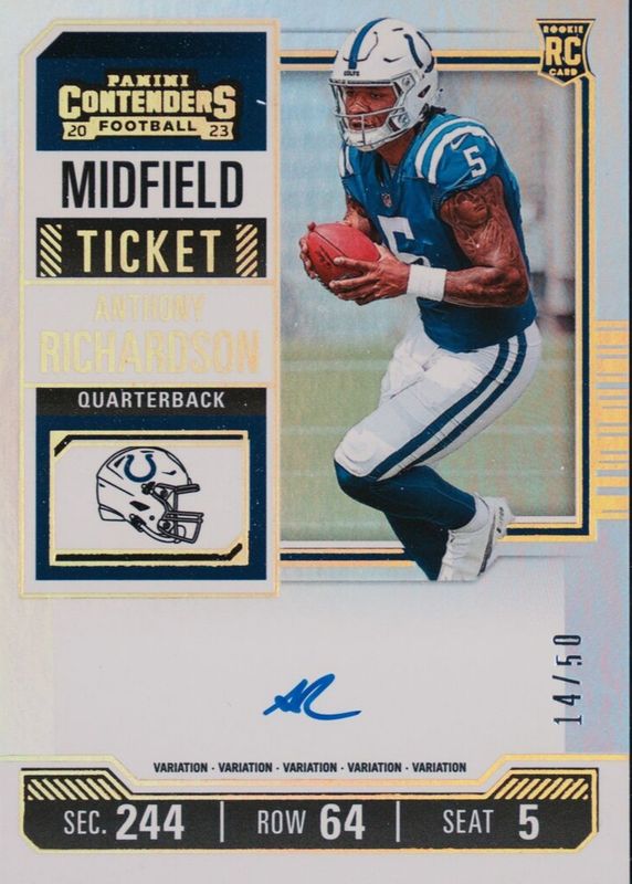 Anthony Richardson 2023 Contenders #102 Rookie Ticket Auto Variation - Midfield Ticket /50 RAW Price Guide