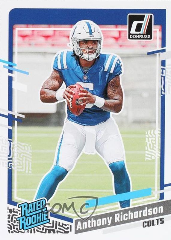 This card is 1 of 66 Anthony Richardson's card variations in the 2023 Donruss set being tracked by Sports Card Investor, including Base, Canvas, Jersey Number (/5), No Name, and Optic Preview - Blue Scope.