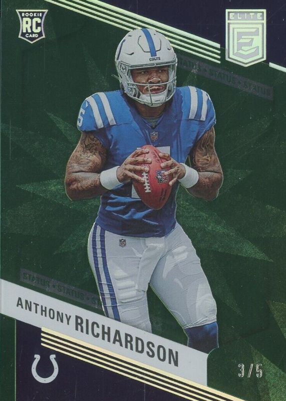 The Anthony Richardson 2023 Elite #102 Status (/5) Rookie card in Raw condition has not changed in price in the last 30 days and was last sold for $350.67 .