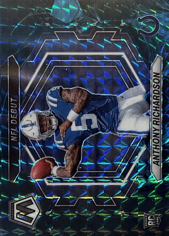 The Anthony Richardson 2023 Mosaic #ND-5 NFL Debut - Genesis /(SSP) Rookie card in Raw condition has not changed in price in the last 30 days and was last sold for $34.33 .