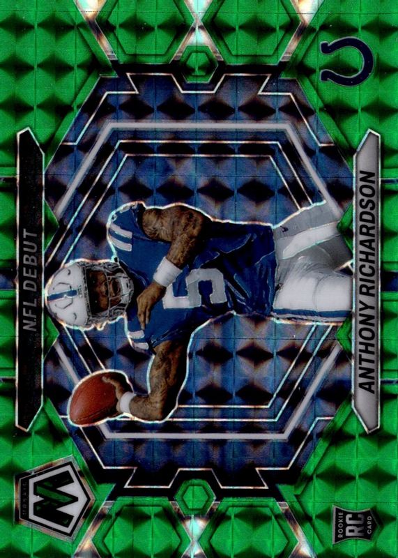 The Anthony Richardson 2023 Mosaic #ND-5 NFL Debut - Green Rookie card in Raw condition has moved up $0.50 (+33.6%) in the last 30 days and was last sold for $1.99 .