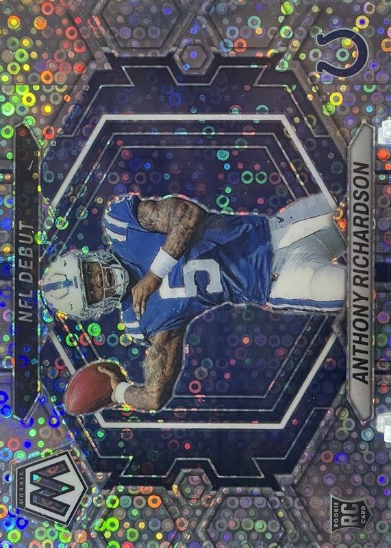 The Anthony Richardson 2023 Mosaic #ND-5 NFL Debut - No Huddle Rookie card in Raw condition has moved up $1.01 (+102%) in the last 30 days and was last sold for $2.00 .