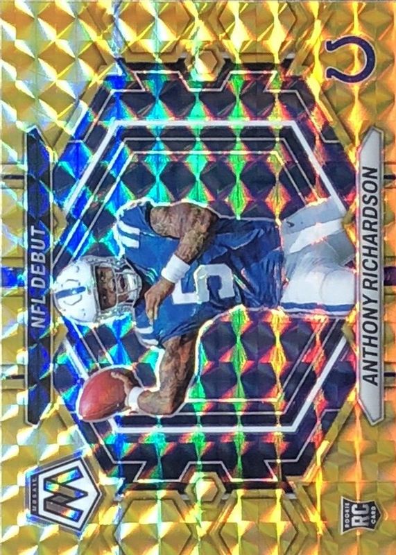 The Anthony Richardson 2023 Mosaic #ND-5 NFL Debut - Reactive Yellow Rookie card in Raw condition has not changed in price in the last 30 days and was last sold for $2.49 .