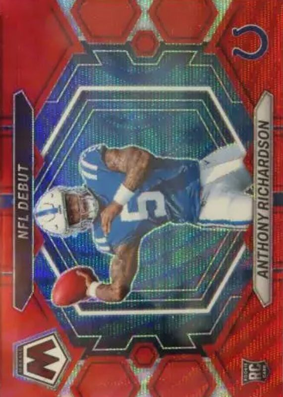 The Anthony Richardson 2023 Mosaic #ND-5 NFL Debut - Red Wave /9 Rookie card in Raw condition has not changed in price in the last 30 days and was last sold for $70.00 .
