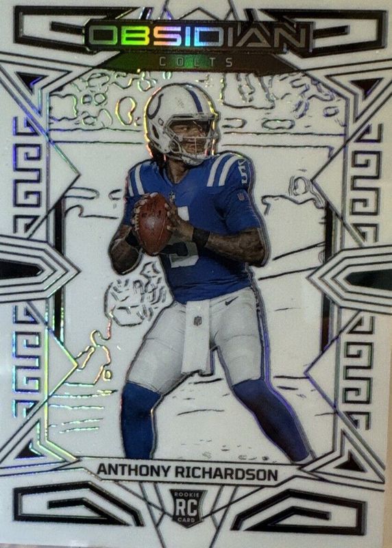 This card is 1 of 48 Anthony Richardson's card variations in the 2023 Obsidian set being tracked by Sports Card Investor, including Base, Asia, Electric Etch Red Flood /90, Electric Etch Purple /75, and Electric Etch Orange /49.