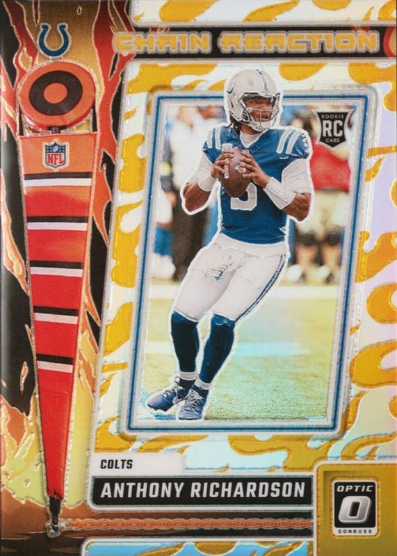 The Anthony Richardson 2023 Optic #CR-AN Chain Reaction - Gold /10 Rookie card in Raw condition has not changed in price in the last 30 days and was last sold for $77.50 .
