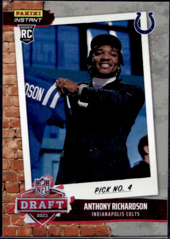 The Anthony Richardson 2023 Panini Instant Draft Night #DN4 Base Rookie card is 1 of 4 Anthony Richardson's card variations in the 2023 Panini Instant Draft Night set being tracked by Sports Card Investor, including Red /25, Versicolor /5, and Black /1.