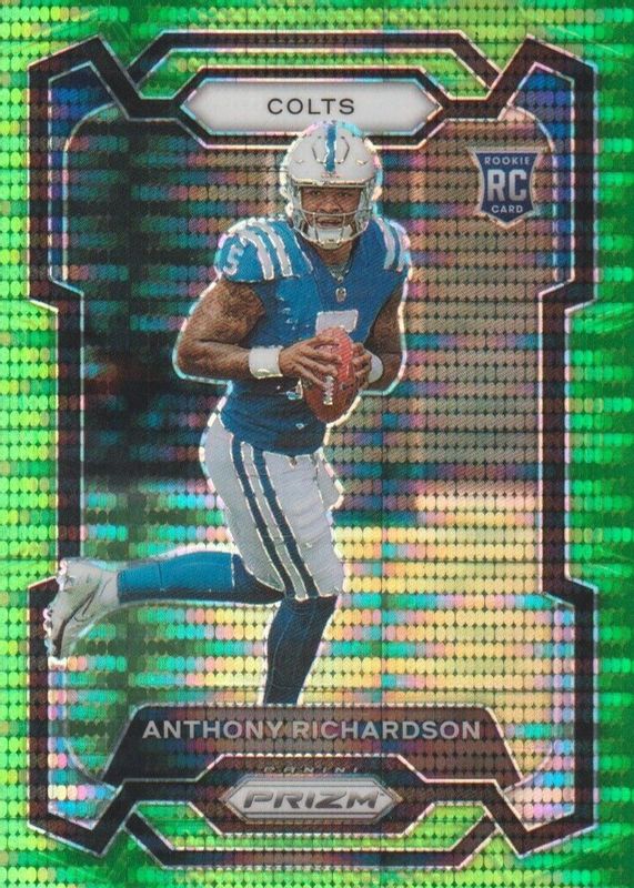 The Anthony Richardson 2023 Prizm #343 Neon Green Pulsar Rookie card in Raw condition has moved up $0.75 (+33.3%) in the last 30 days and was last sold for $3.00 .