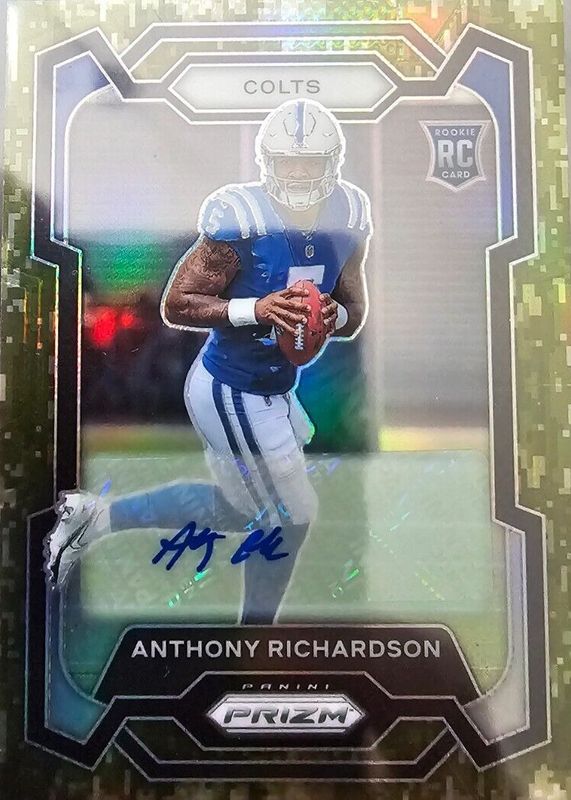 The Anthony Richardson 2023 Prizm #343 Rookie Autographs - Camo /25 card in Raw condition has not changed in price in the last 30 days and was last sold for $2,401.89 .