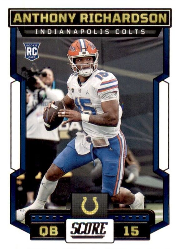 This card is 1 of 10 Anthony Richardson's card variations in the 2023 Score set being tracked by Sports Card Investor, including Rookie Signatures, Rookie Signatures - Green, Next Up /(SSP), Rookie Signatures - Gold Zone /50, and Rookie Signatures - Artist's Proof /35.
