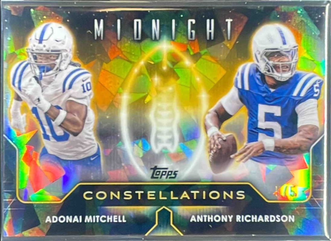 The Anthony Richardson 2024 Topps Midnight #C-9 Constellations - Daybreak /5 card is 1 of 55 Anthony Richardson's card variations in the 2024 Topps Midnight set being tracked by Sports Card Investor, including Base, Moon Beam, Zodiac, Morning /149, and Twilight /99.