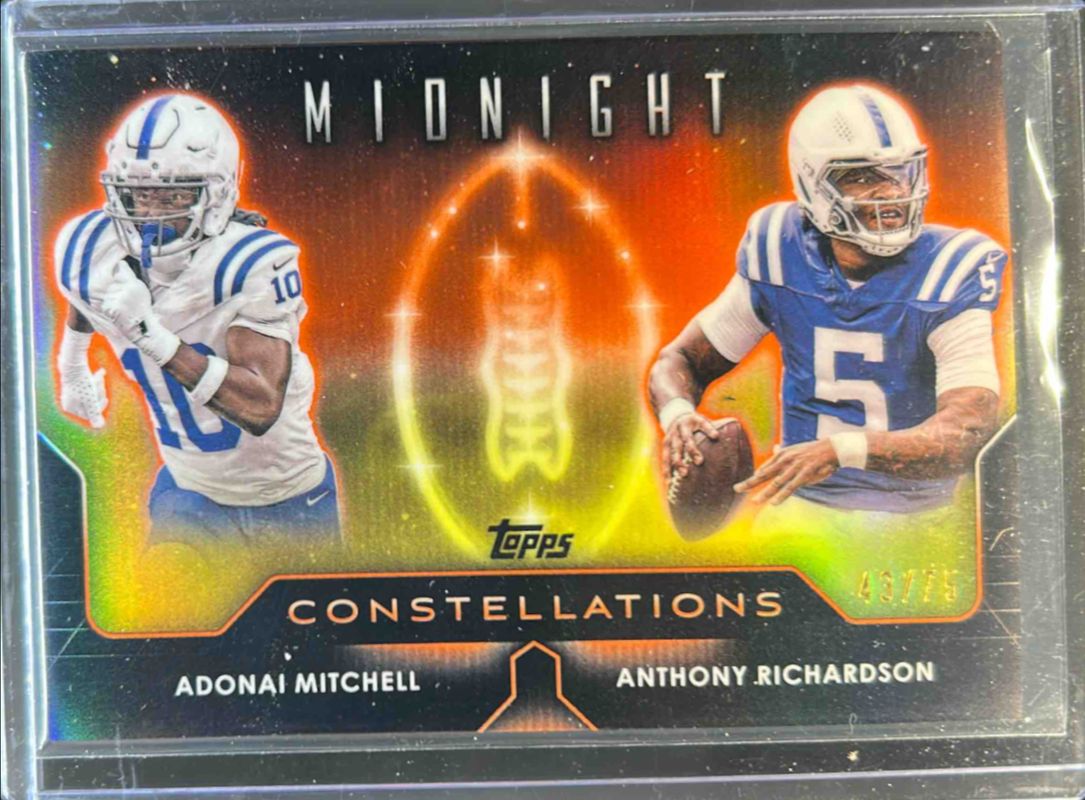 The Anthony Richardson 2024 Topps Midnight #C-9 Constellations - Dusk /75 card is 1 of 55 Anthony Richardson's card variations in the 2024 Topps Midnight set being tracked by Sports Card Investor, including Base, Moon Beam, Zodiac, Morning /149, and Twilight /99.