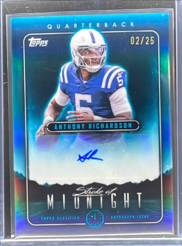 The Anthony Richardson 2024 Topps Midnight #SMA-AR Stroke of Midnight Autographs - Moonrise /25 card is 1 of 55 Anthony Richardson's card variations in the 2024 Topps Midnight set being tracked by Sports Card Investor, including Base, Moon Beam, Zodiac, Morning /149, and Twilight /99.